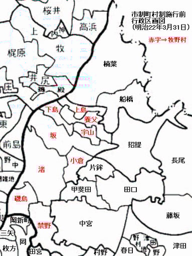 町村制施行により、赤字の9村が合併して牧野村となる。
